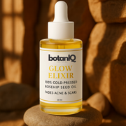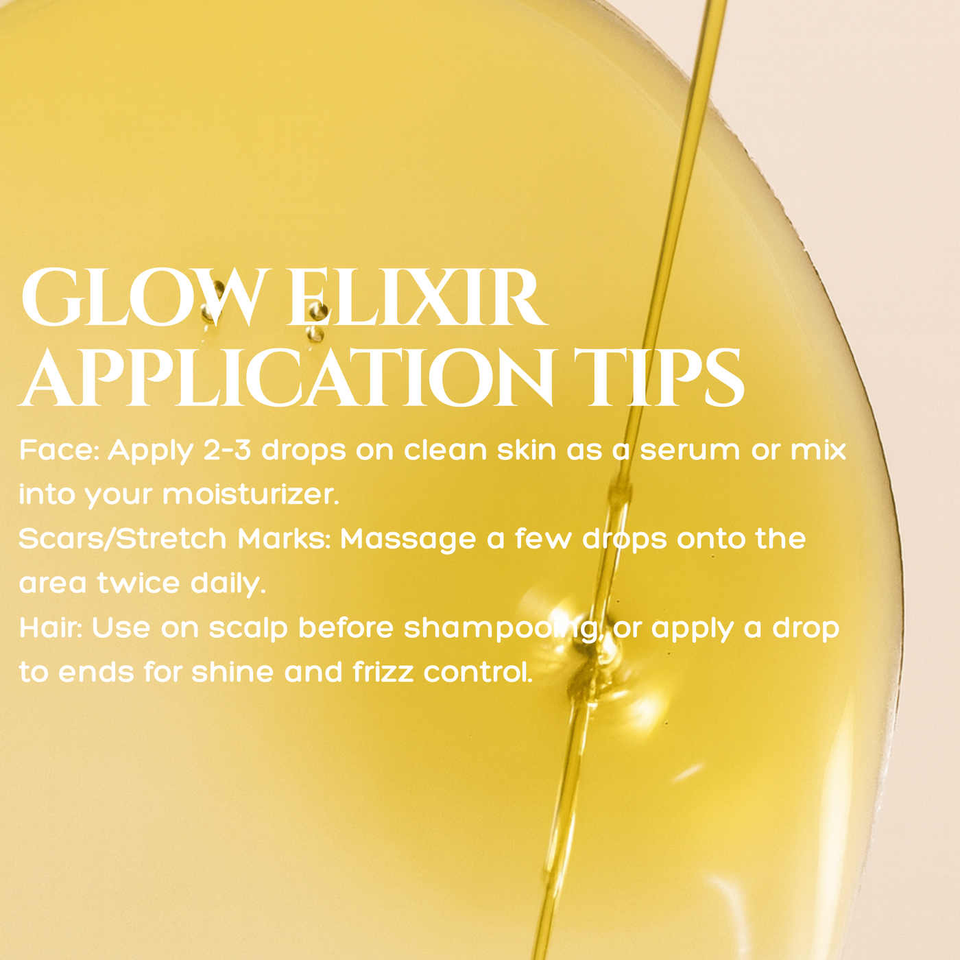Glow Elixir is a 100% cold-pressed Rosehip Seed Oil that deeply nourishes and repairs the skin. Packed with vitamins and essential fatty acids, it helps fade acne scars, smooth fine lines, and restore a natural, healthy glow.